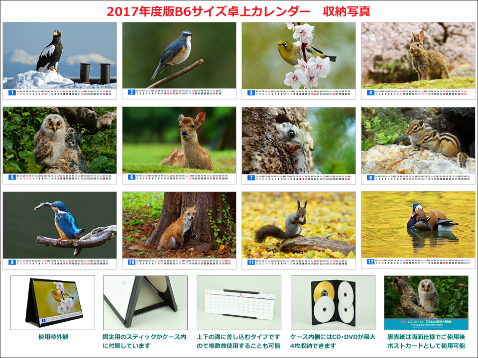 印刷物は増刷すればいいのですが、このタイプは特殊なハードケースを使用しており、そのケースの確保・調達が困難であることが判明いたしました。よって卓上タイプカレンダー「日本の動物と野鳥」は在庫限りとさせていただきます